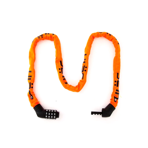 Cadena de 5mm con cerradura con combinación. La cadena de acero endurecido está recubierta de una funda de nylon de alta calidad para proteger la pintura de la bicicleta. Se puede transportar enroscada en el tubo horizontal. Excelente para ciclistas urbanos,